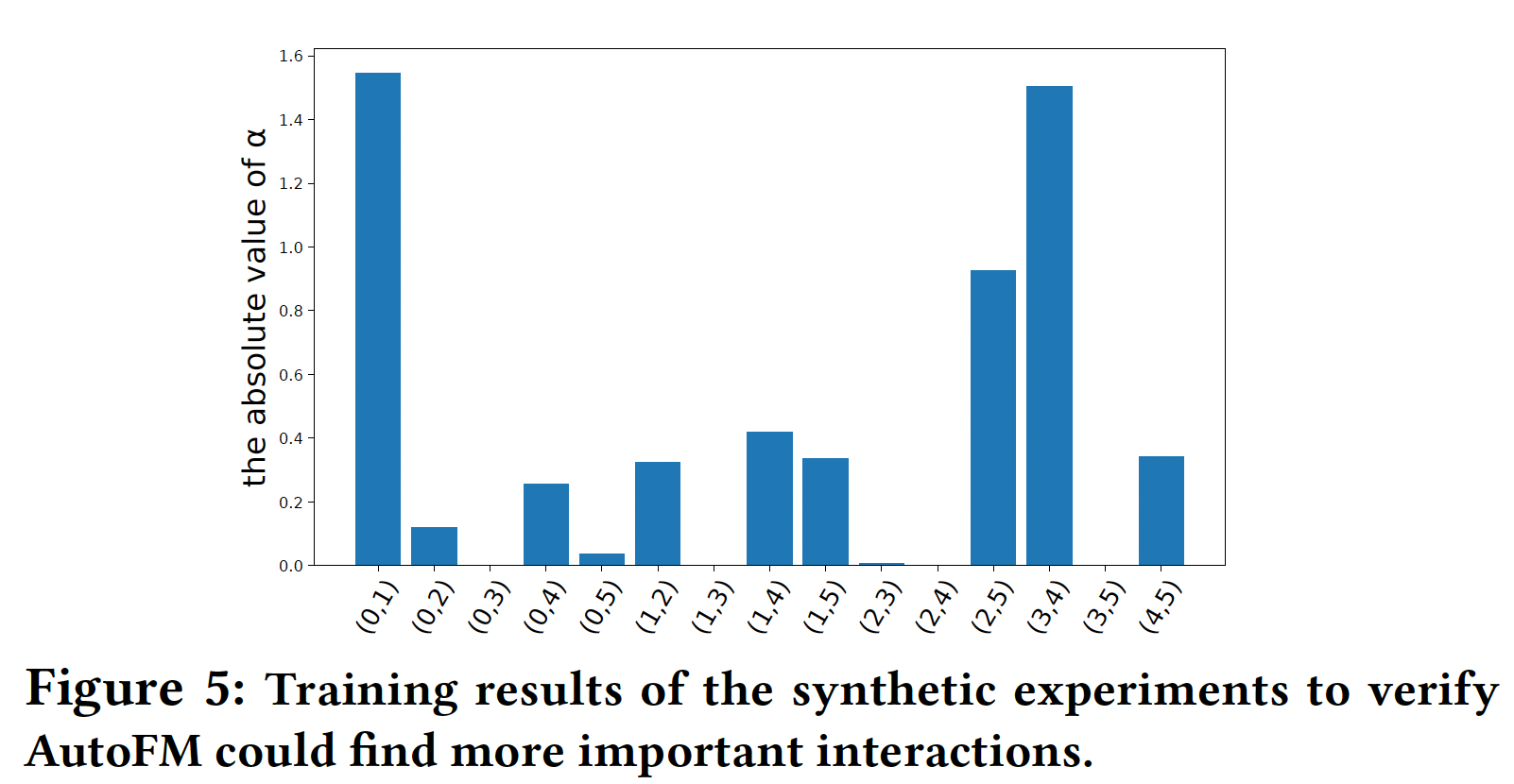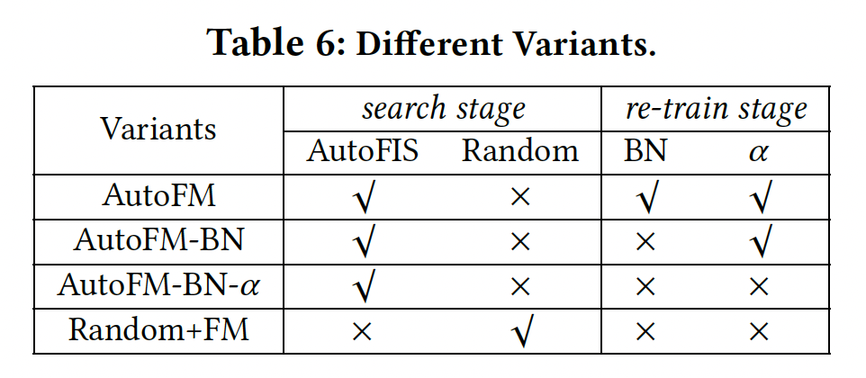 比较 AutoFM-BN-𝛼 和 Random+FM ,我们可以看到:在相同数量的交互下,AutoFIS 的选择总是能取得比随机选择更好的性能。这说明在搜索阶段 AutoFIS 就能识别出重要的交互。