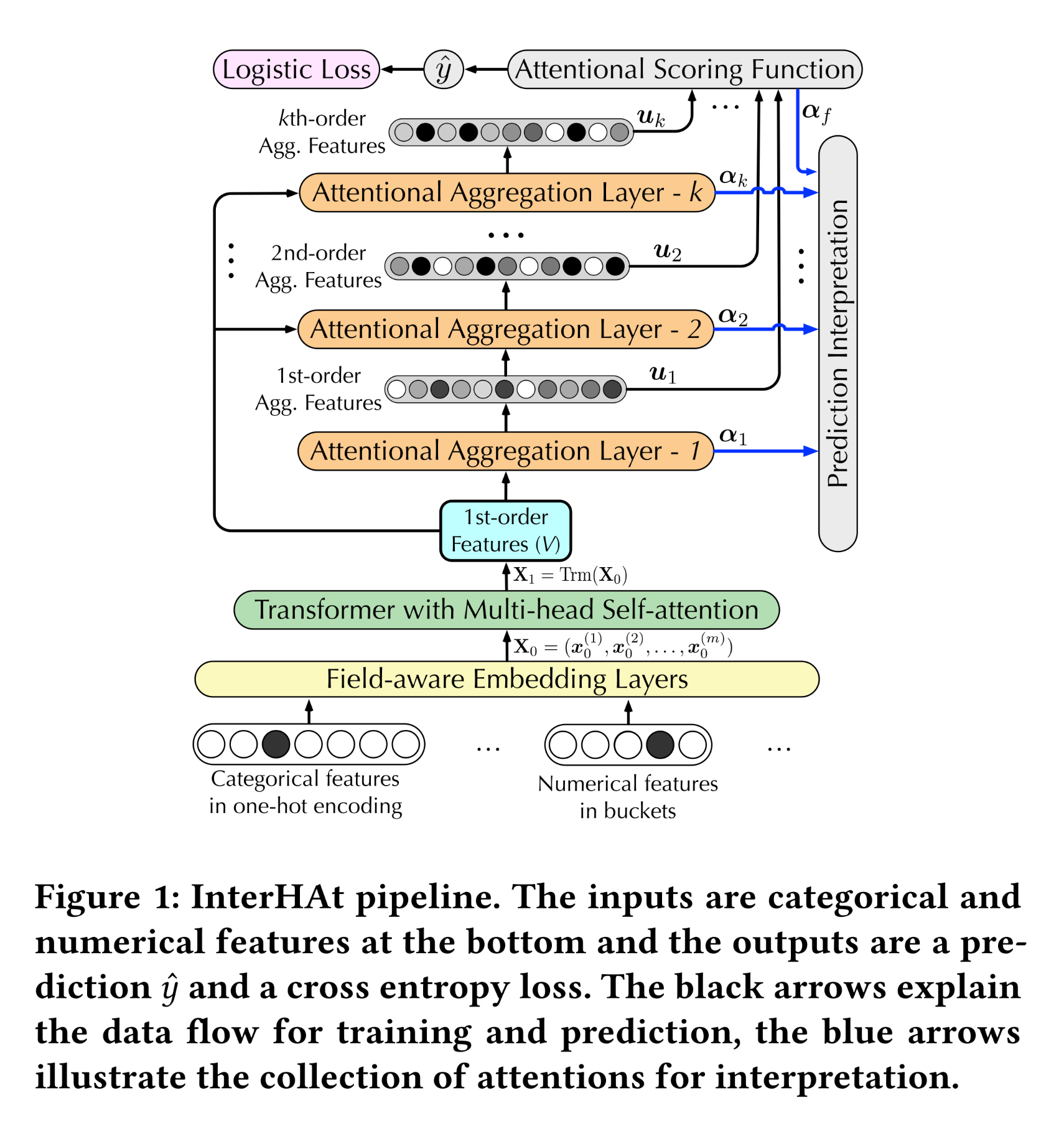在本文中,我们提出了 InterHAt 模型,该模型采用 a Transformer with multi-head self-attention 进行 feature learning。在此基础上,利用 hierarchical attention layers 进行点击率预测,同时为预测结果提供可解释性的洞察。InterHAt 通过一种计算复杂度低的且高效的 attentional aggregation 策略来捕获 high-order feature interactions。在四个公开的真实数据集和一个合成数据集上进行的大量实验证明了 InterHAt 的有效性和效率。