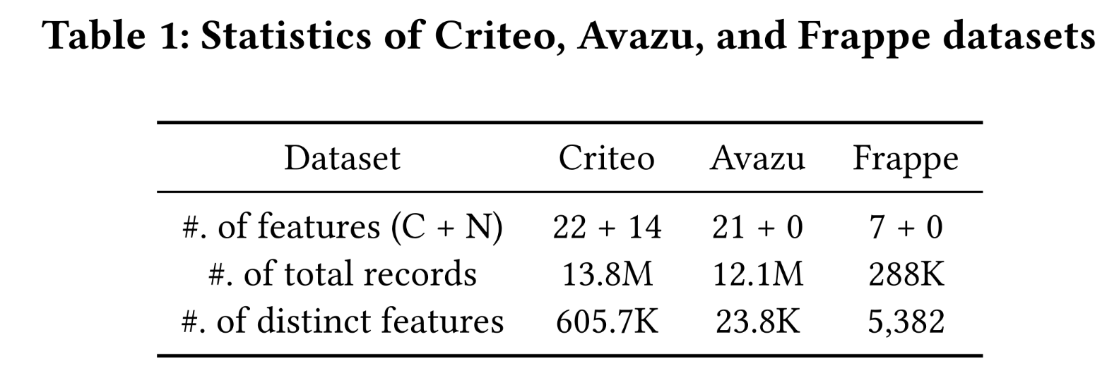 Criteo 和 Avazu 包含来自两家在线广告公司(Criteo 和 Avazu)的按时间顺序排列的 click-through records。我们使用它们的 top 30% records 进行评估。