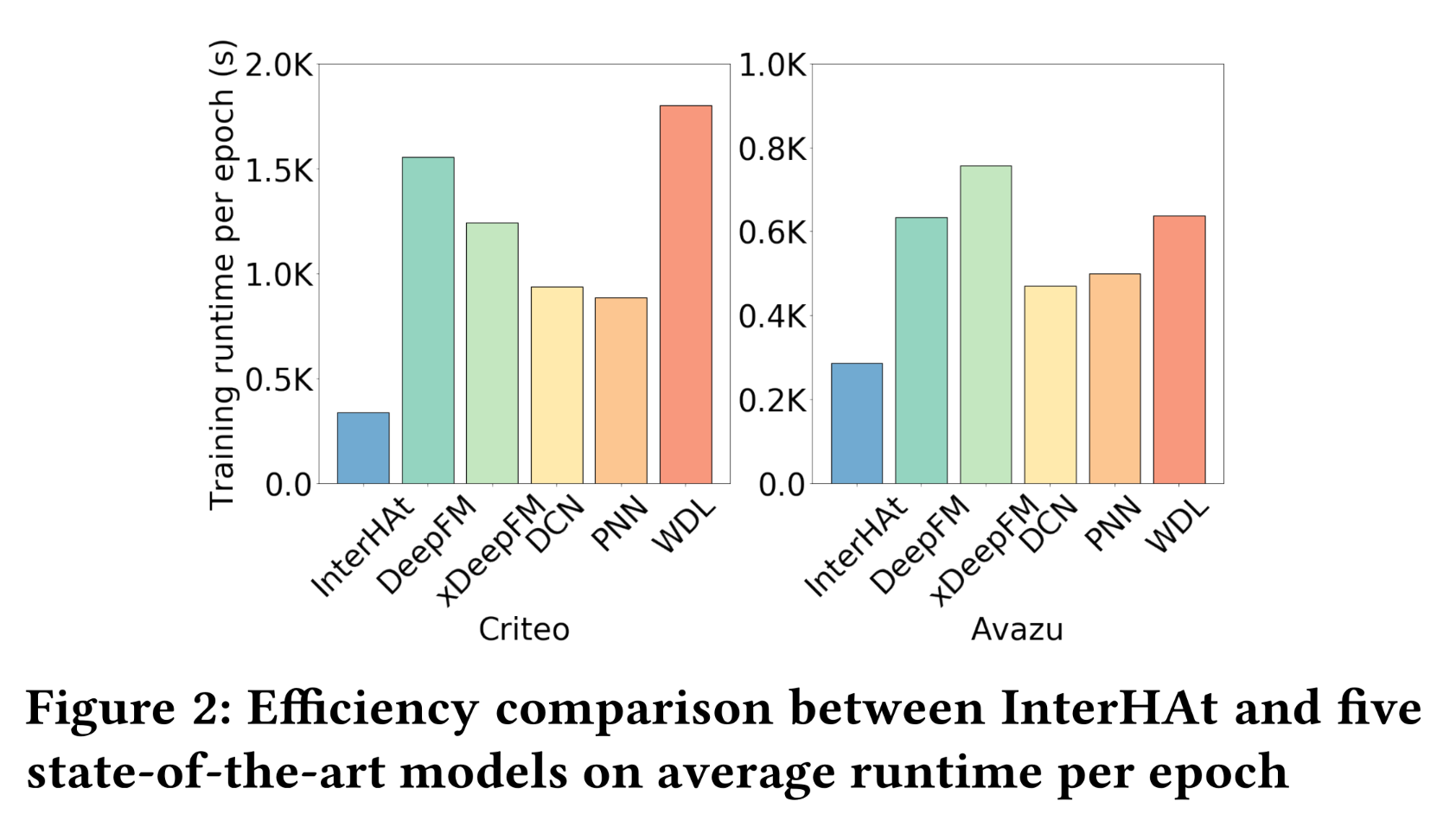 效率:Figure 2 展示了 InterHAt 与五个 SOTA 模型在 Criteo 和 Avazu 数据集上的 GPU 实现的运行时间比较。由于Frappe 数据集的规模相对较小,计算开销占运行时间的大部分,因此未将其用于效率测试。FM 也未被使用,因为只有基于CPU 的实现可用。y 轴表示五个 training epochs 后的平均每个 epoch 的运行时间,其中在 5 个 training epochs 之后所有模型开始明显收敛。硬件设置与实验设置部分中提到的相同。