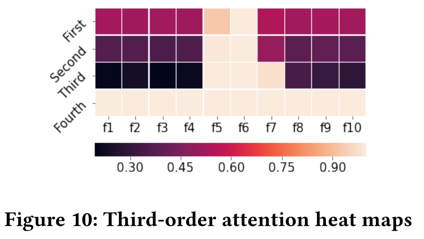 Rule 3 展示了高阶场景下的可解释性。我们在 Figure 10 中包含了从一阶到四阶的热力图。从前三行中,我们发现 InterHAt 从数据集中获取 feature interaction 知识的过程。
