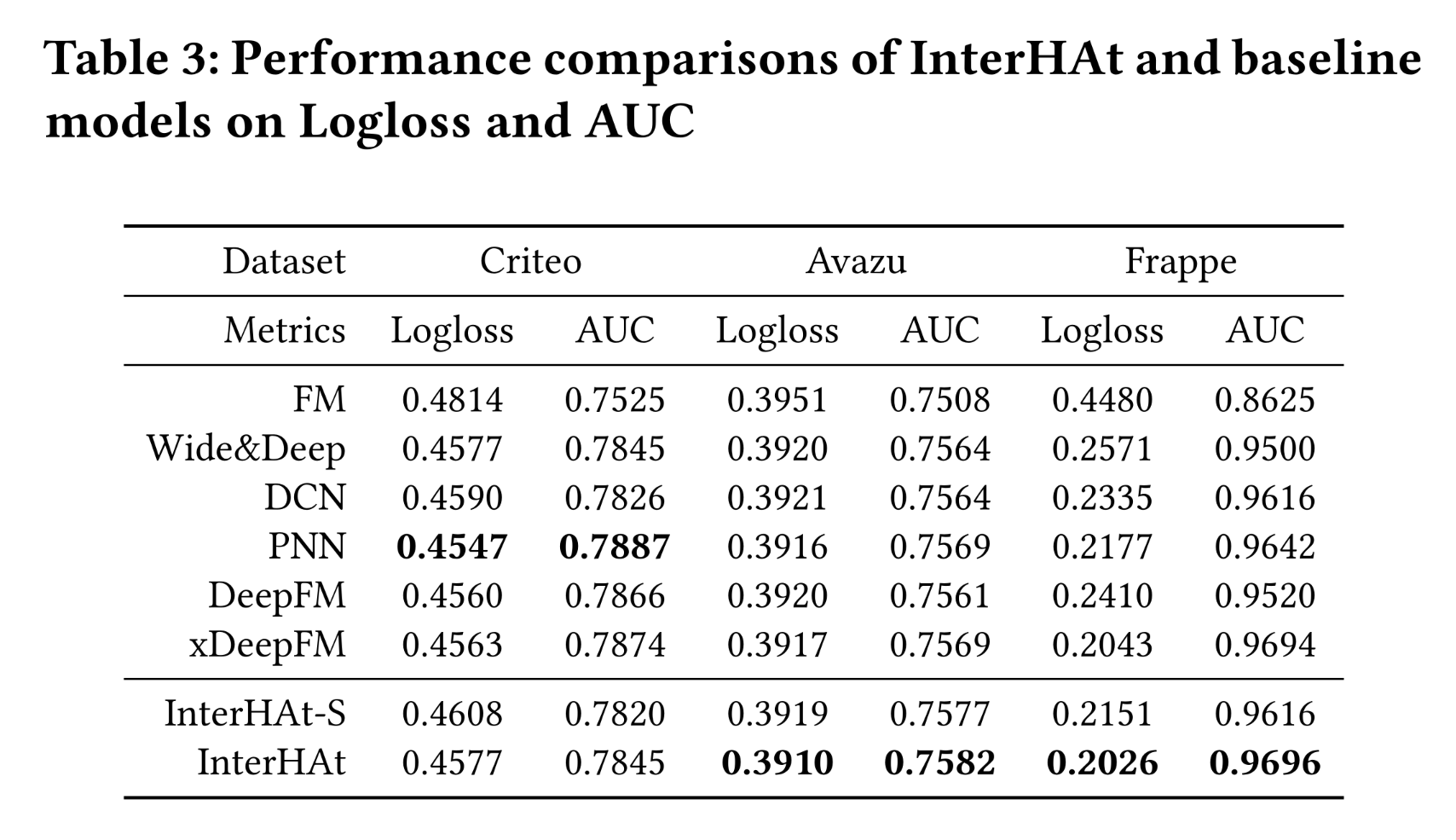 baseline 方法:将 InterHAt 的性能与以下专门为 CTR 任务设计的 SOTA 方法进行比较: