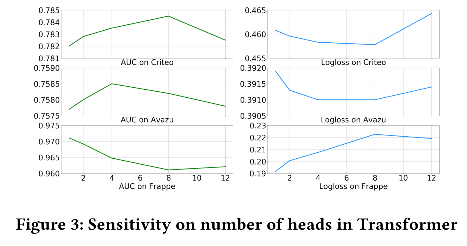 结果证明了复杂数据集的 click-through records 中存在语义的多个方面(即特征多义性 feature polysemy ),并证明了使用 multi-head Transformer 的合理性。随着 heads 数量的增加,由于过参数化(over-parameterization),性能会下降。