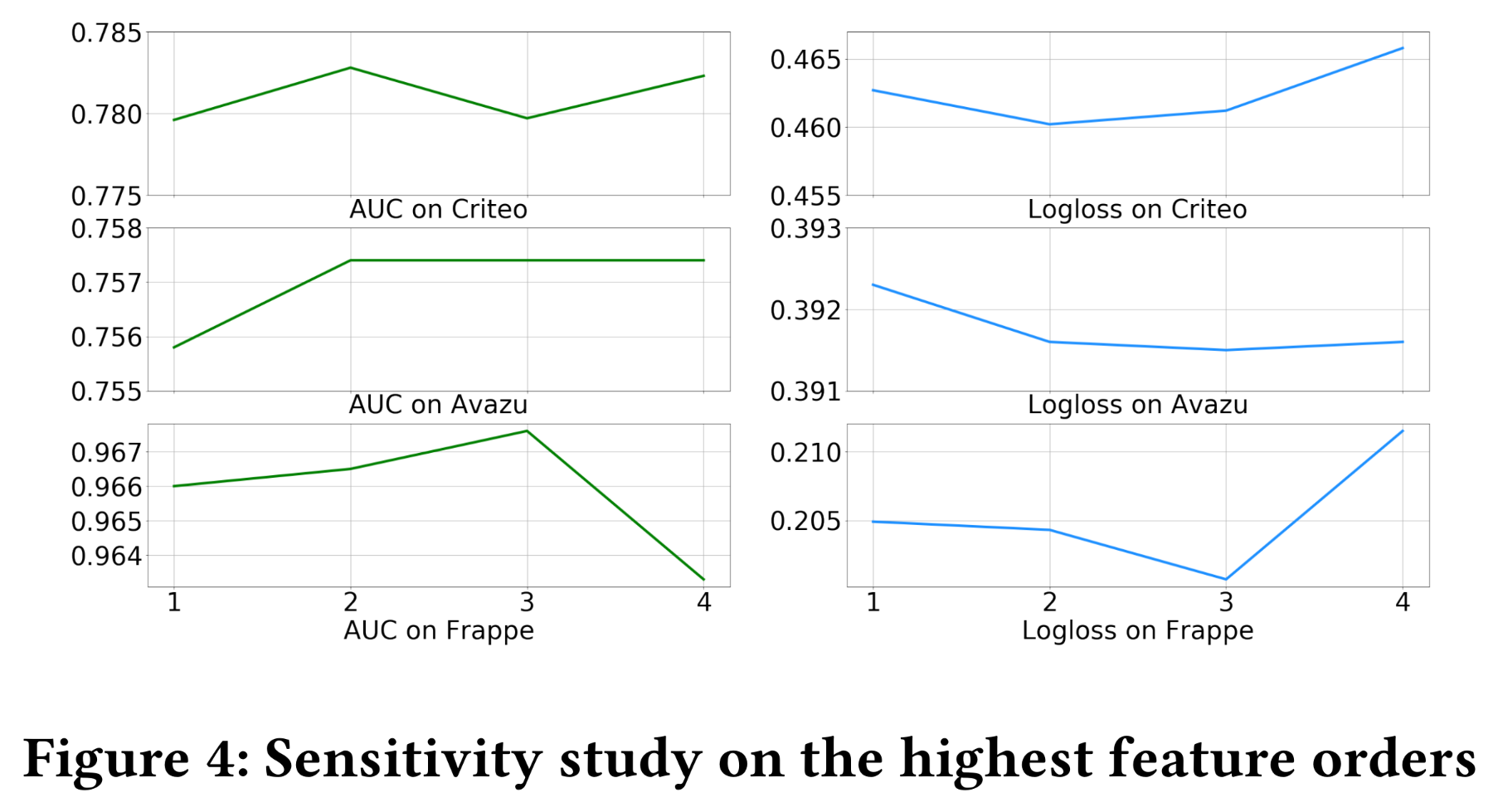 在大型数据集( Criteo 和 Avazu )上,当阶数增加时,AUC 和 Logloss 有微小波动。