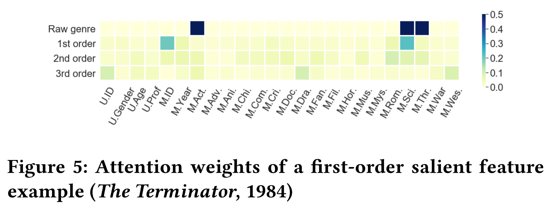 Figure 5 显示了对电影《终结者 The Terminator 》( 1984 年)的评分,该评分在一阶特征上具有最大的 aggregation attention weight 。在这条记录中,我们观察到电影 ID (M.ID )和科幻类型(M.Sci. )在 1st-order row 中明显优于其他单元格,这归因于电影本身的高声誉及其作为科幻电影(Science Fiction: Sci-Fi)的突出特点。InterHAt 还检测到另外两个类型标签(动作 Action 和惊悚 Thriller )对 prediction 而言不够准确,因此没有被突出显示。没有观察到强烈的更高阶的交互,因为人们可能已经通过《终结者》作为科幻电影的良好声誉做出了观看决定。
