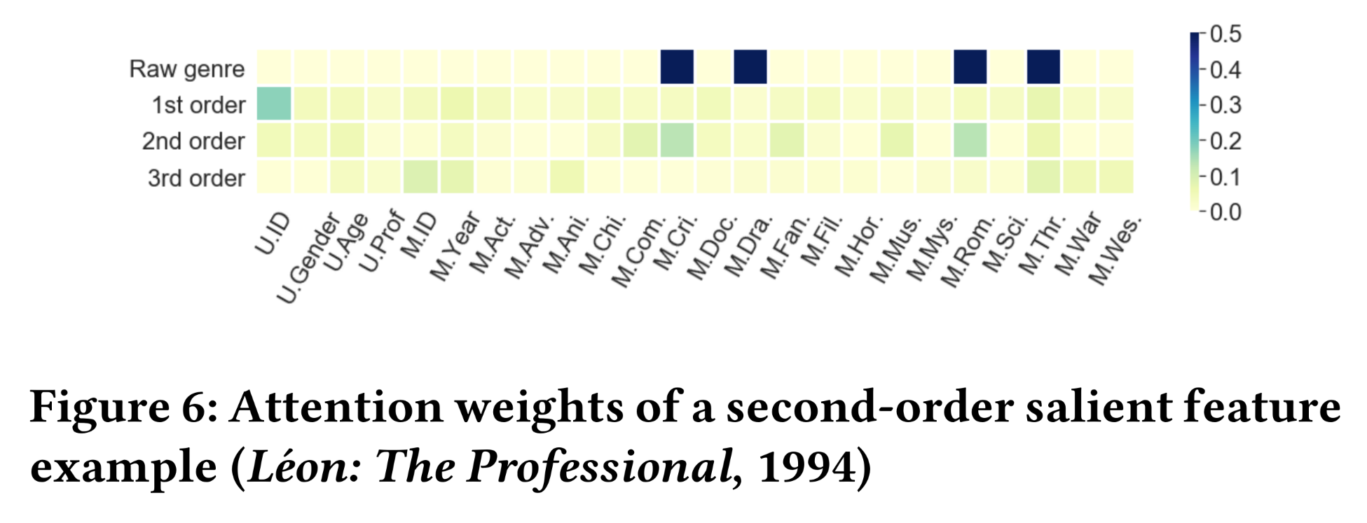 Figure 6 展示了一个以二阶交互为主的案例,即对《这个杀手不太冷 Léon: The Professional 》(1994年)的评分。我们观察到一个一阶特征和两个二阶特征具有更高的“热力”。