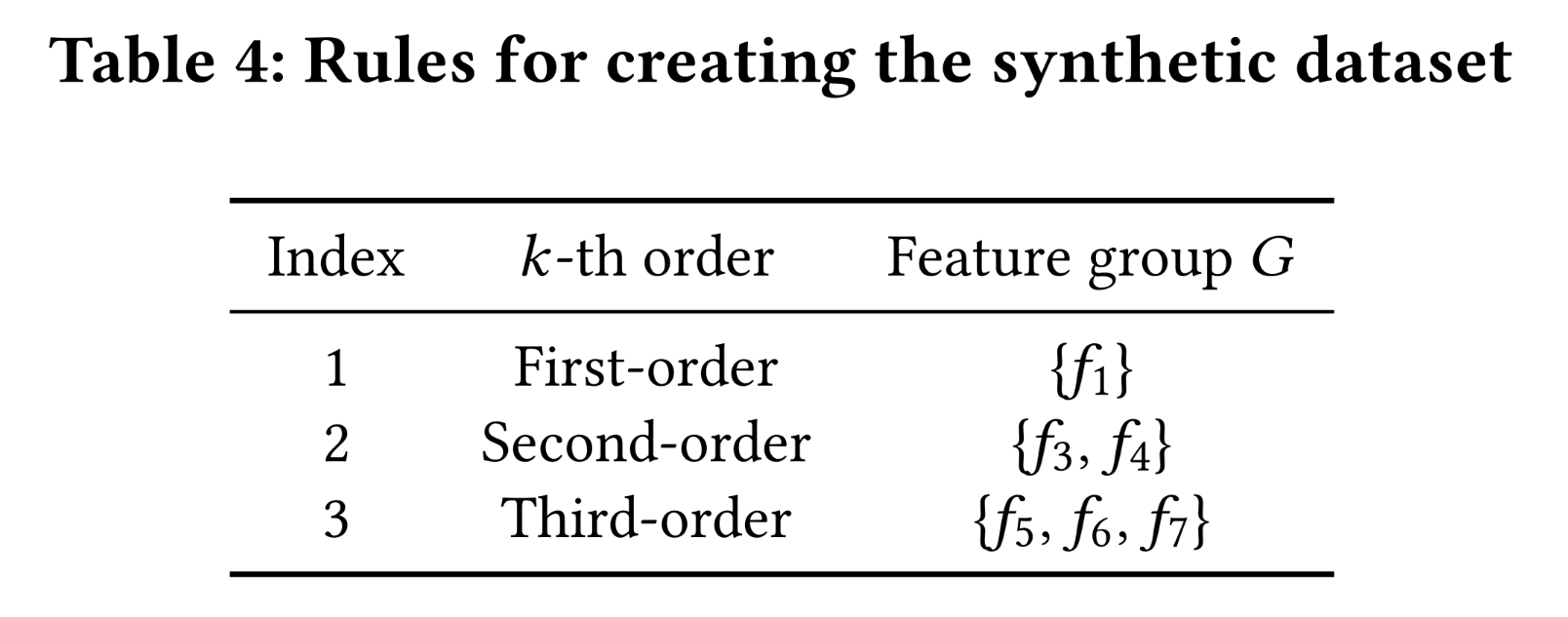 数据集:考虑到 MovieLens-1M 实际上是评分数据而非点击数据,我们使用合成数据进行了一系列实验以展示可解释性。合成数据包含 100k 条合成的 click-through records,其中有 10 fields click-through records 。每个 field 被独立地创建,取值范围为 feature groups 决定,使用 Table 4 中的规则:对单独地或联合地影响 CTR prediction 的 feature groups 的模拟。标签的确定方式如下:给定 a feature group