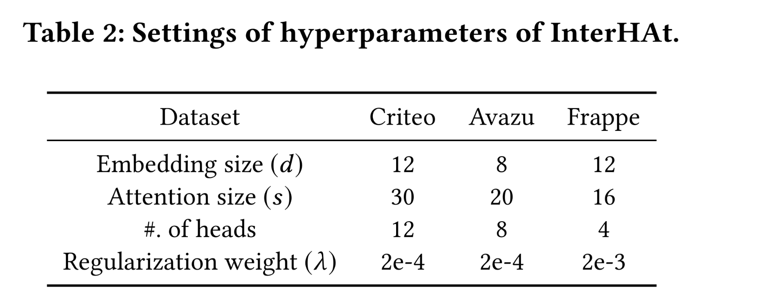 InterHAt 在 Criteo 数据集上与其他模型几乎持平的原因是:与 Avazu 和 Frappe 数据集相比,Criteo 数据集的特征在语义(semantics)上更复杂。baseline 模型使用无法解释的 deep 全连接(fully-connected: FC )层来捕获复杂的隐式信息并提高性能。然而,InterHAt 没有使用损害模型可解释性的 deep FC layers 。此外,当前的 field-aware embedding 策略(其中 numerical fields 只有一个 embedding InterHAt 对 numerical-numerical feature interactions 和 categorical-numerical feature interactions 进行参数化的能力。我们将探索适当的 feature representation 和 parameterization 方案作为未来的工作。