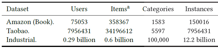 这些数据集的统计信息如下表所示。注意,对于Industrial Dataset,item 为广告。