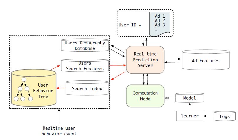 life-long 用户行为数据在线serving 的挑战:工业级的推荐系统或广告系统需要在一秒钟内处理的大量的流量请求,这需要 CTR 模型实时响应。通常, serving latency 应该小于 30 毫秒。下图简要说明了我们在线展示广告系统中用于 CTR 任务的实时预测Real Time Prediction: RTP系统。该系统由两个关键组件组成:计算节点(Computation Node)、预估server 。