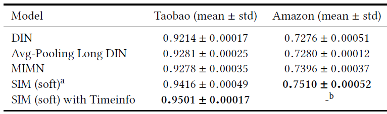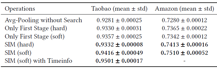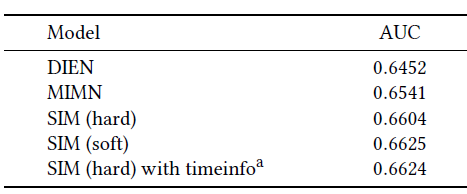 实验结果表明:SIM 优于所有其它长期兴趣模型。这充分证明了我们提出的两阶段搜索策略对于长期用户兴趣建模很有用。而且,包含time embeding 可以实现进一步的提升。