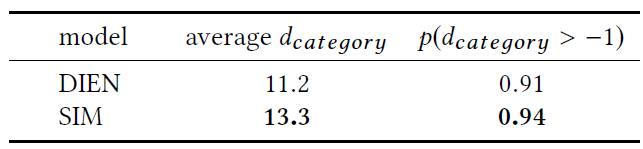 结果表明:SIM 的提升确实是更好的长期兴趣建模的结果。并且和 DIEN 相比,SIM 倾向于推荐与人们长期行为有关的item 。