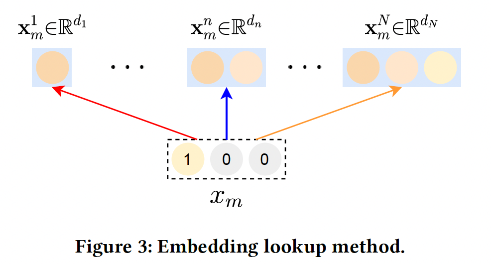 Embedding Lookup:对于每个 user-item 交互样本,我们有 feature field ,如性别、年龄等等。对于第 feature field,我们分配了 emebdding 空间 embedding 空间的维度分别为 embedding 空间的 cardinality 是该 feature field 中 unique feature value 的数量。