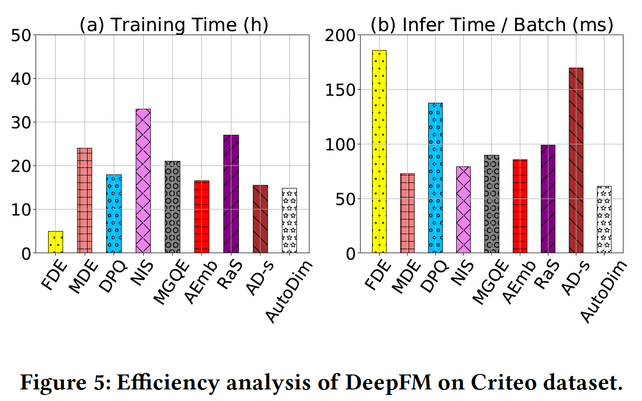 FDE 的训练速度最快,因为我们直接把它的 embedding 维度设置为 32 ,即没有搜索阶段。然而它的推荐效果是所有方法中最差的。