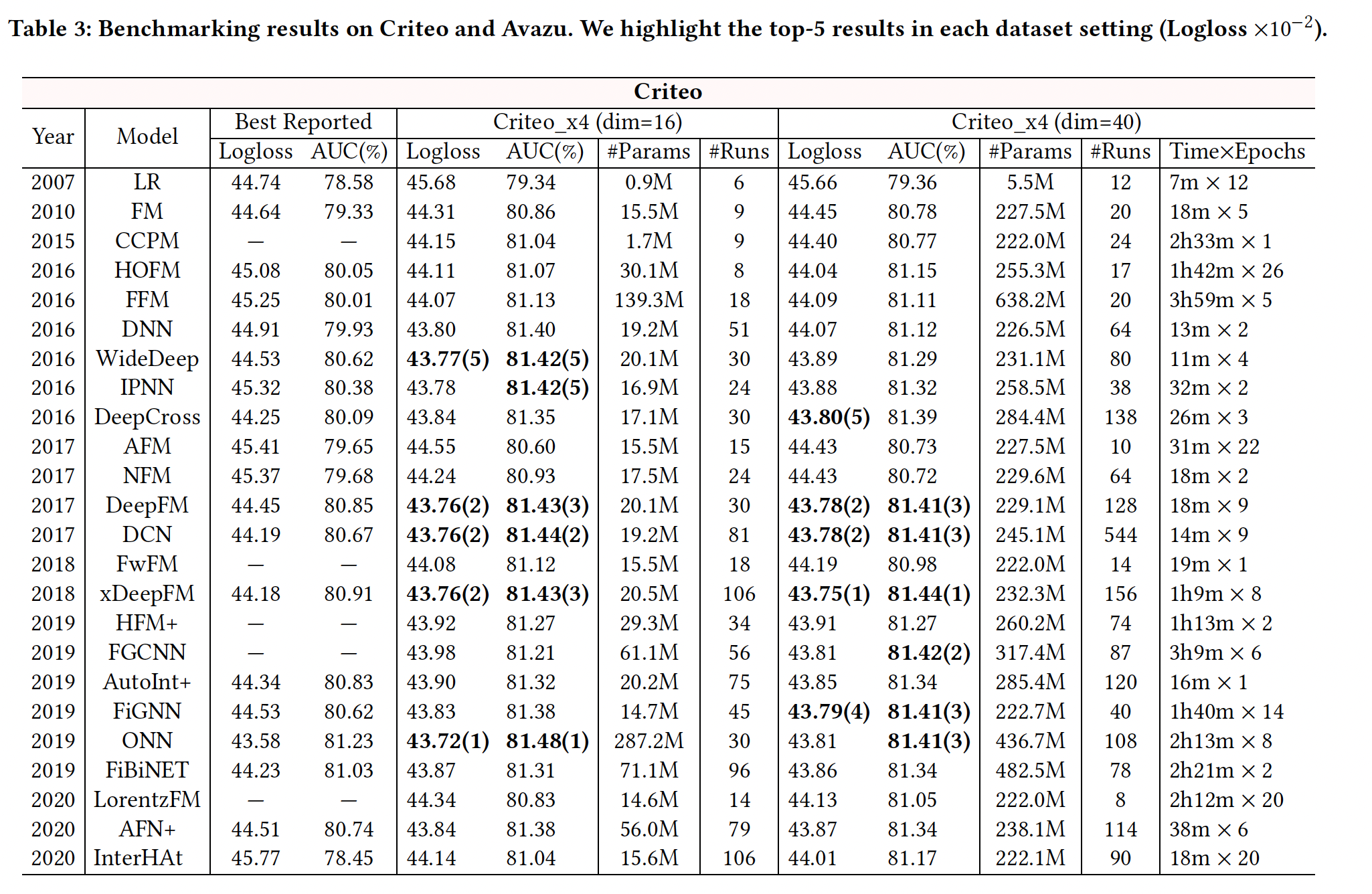 现有研究报告中的最佳结果显示出一定的不一致性。如:InterHAt 在两个数据集上的表现都比 LR 差;DeepCross 在 Avazu 上的表现也比 LR 差。