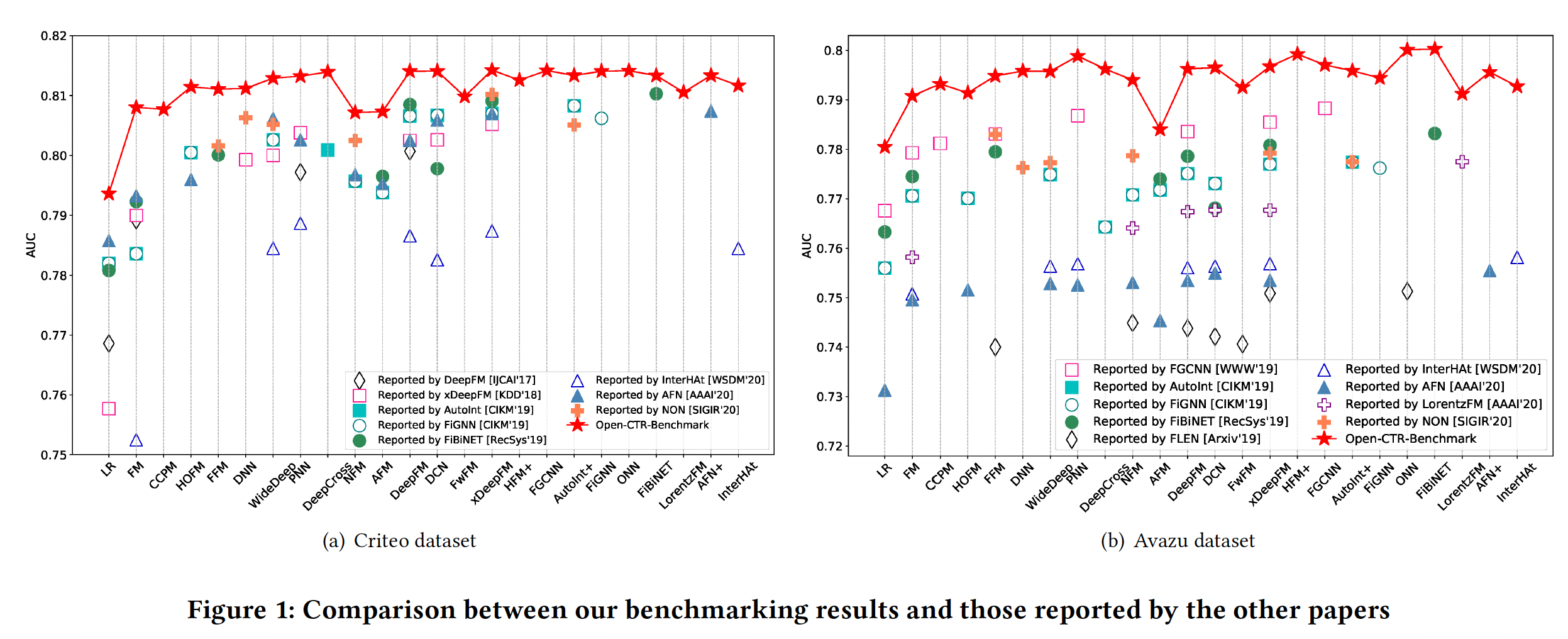 尽管这些研究取得了成功,但仍然缺乏标准化的 benchmark 和统一的 CTR 预测任务的评估协议。因此,即使采用了一些常见的数据集(如 Criteo 和 Avazu),现有的研究往往会进行他们自己的数据集拆分(例如,使用未知的 train-test 拆分,或使用未知的随机数种子)、以及预处理步骤(关于如何处理数值特征,以及如何过滤低频的categorical feature )。这导致了这些研究中的实验结果不可复现,甚至不一致,因为他们的非标准化的数据预处理使得任何两篇不同的论文的结果都没有可比性。每项工作都声称在他们自己的 data partition 上取得了显著改进的最佳结果,然而没有人知道:如果采用相同的评估协议进行公平的比较会是什么结果。由于缺乏公开的 benchmarking 结果作为参考,读者可能会怀疑论文中的 baseline 模型是否实现正确、是否经过了严格的超参数调优,但是这些研究都没有报告细节、也没有公开他们 baseline 实现的源代码。在某些 case 中,一些流行模型的官方或第三方源代码是可用的(如 DeepCTR ),但我们发现关于超参数设置、数据加载、以及 early stopping 的训练细节通常是缺失的,这使得我们很难重用代码来复现已有结果。 这种不可复现性和不一致性问题在很大程度上限制了该领域研究的实用价值和潜在影响。