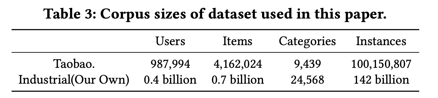 我们的工业数据集自然有正样本和负样本,因为我们记录了每个用户的所有 impressions 。如果用户点击了该 item ,则 impression 被标记为正样本;否则,它被标记为负样本。