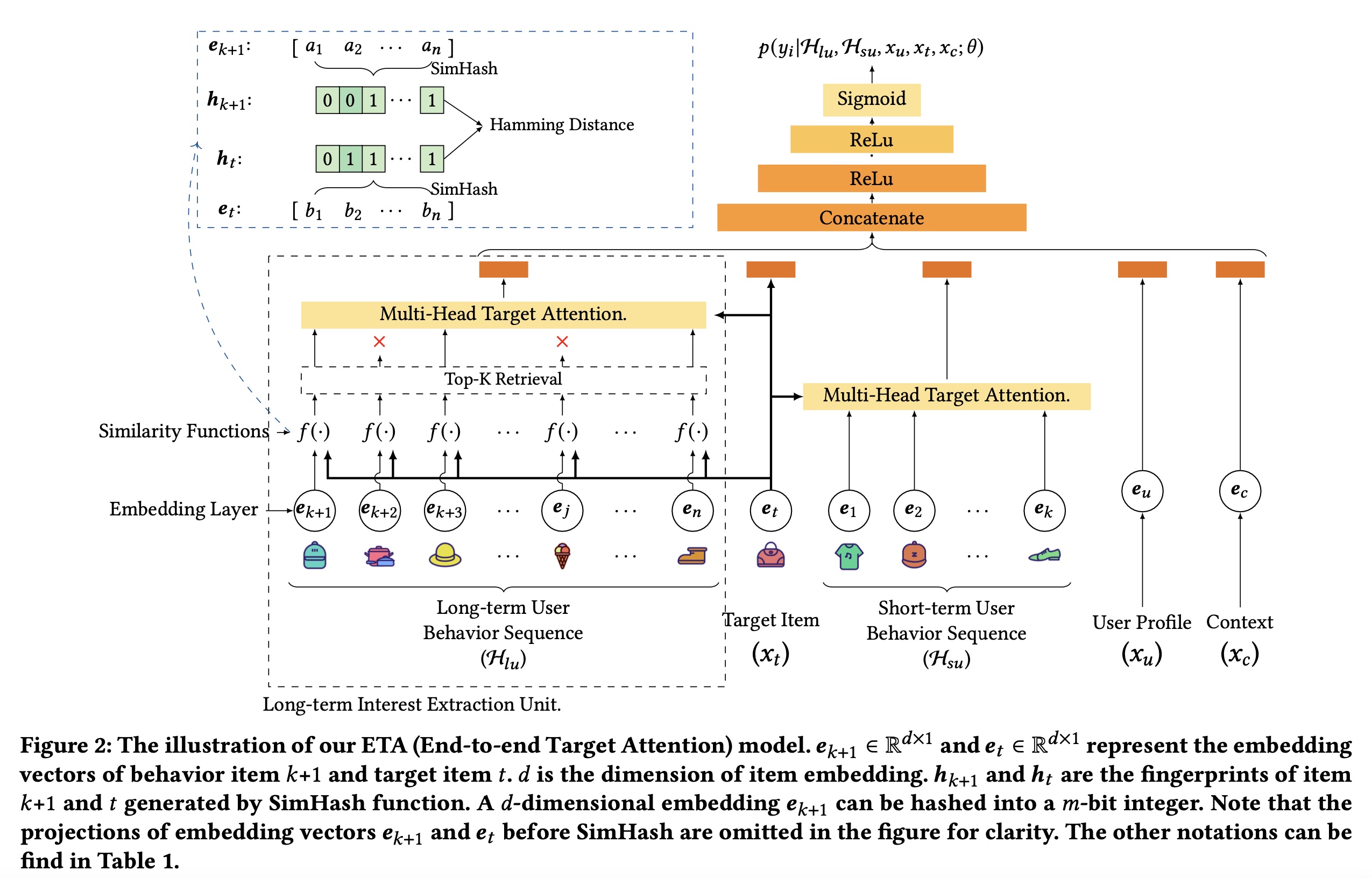 我们针对 CTR prediction 任务提出了一种端到端的 Target Attention 方法,称为 End-to-end Target Attention: ETA 。据我们所知,ETA 是第一个以端到端方式使用 CTR 模型对长期用户行为序列进行建模的工作。