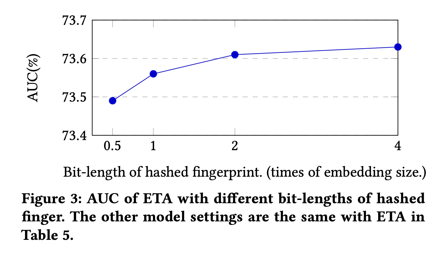 但是,当 bit-length 大于 2 倍 embedding size 时,AUC 的改进变得微不足道。