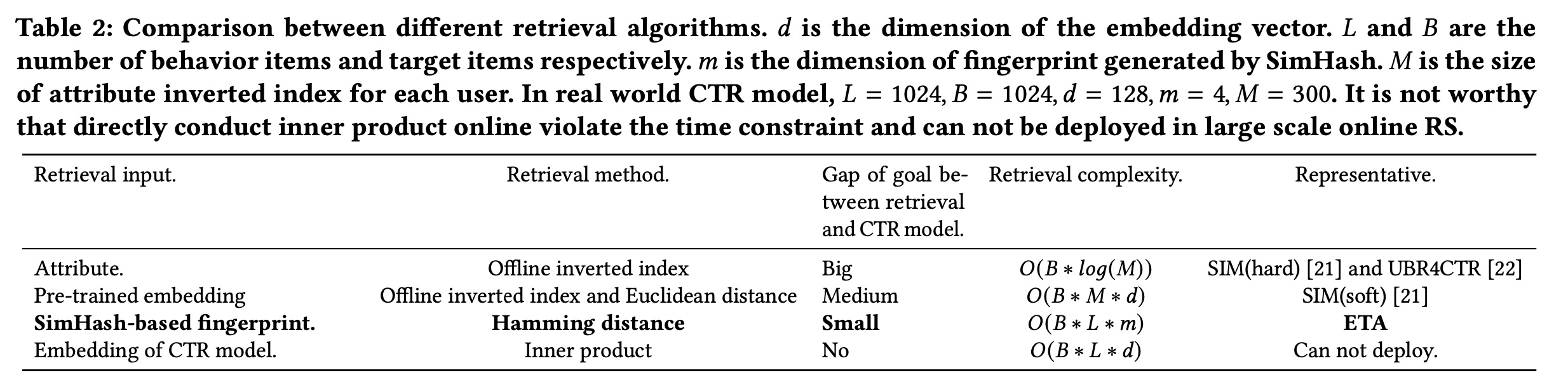 在本文中,我们提出了一种称为 ETA 的方法,可以实现端到端的长期用户行为的检索,以缓解 CTR prediction 任务中上述 information gap (即不一致的目标和过时的 embedding )。我们使用 SimHash 为用户行为序列中的每个 item 生成指纹。然后使用汉明距离来帮助选择 top-k 的item 从而用于 target attention 。我们的方法将 retrieval 复杂度从 CTR 模型要评分的 target items 数量,item embedding 的维度。复杂度的降低有助于我们在训练和服务过程中移除离线辅助模型并进行实时检索。与 SOTA 模型相比,这大大提高了 ranking improvements 。我们论文的贡献可以概括为三点: