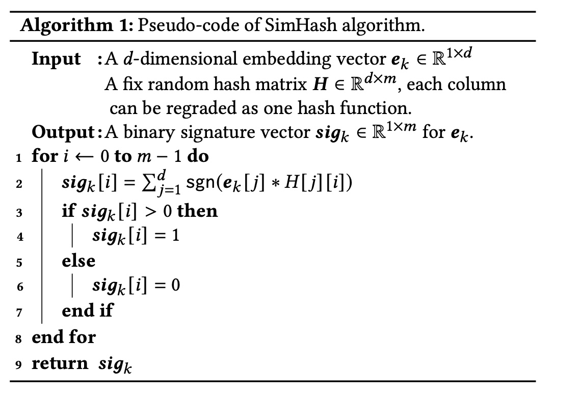 SimHash 算法最早由 《Similarity estimation techniques from rounding algorithms》 提出,其中一个著名应用是 《Detecting near-duplicates for web crawling》,它通过 SimHash based 的指纹检测重复的网页。SimHash 函数将 item 的 embedding vector 作为输入,并生成其二进制指纹。Algorithm 1 显示了 SimHash 的一种可能的实现的伪代码。