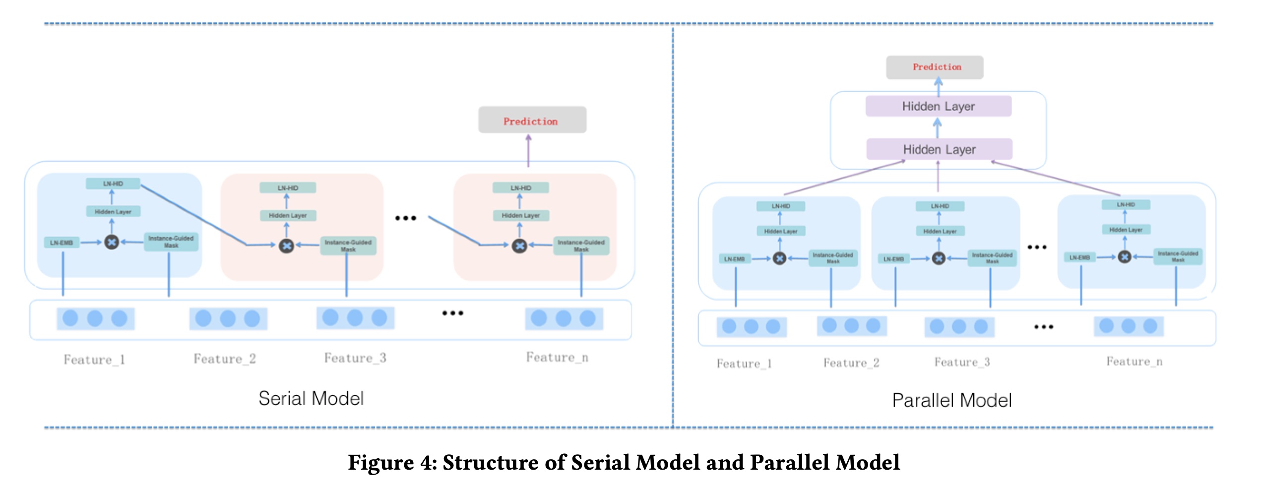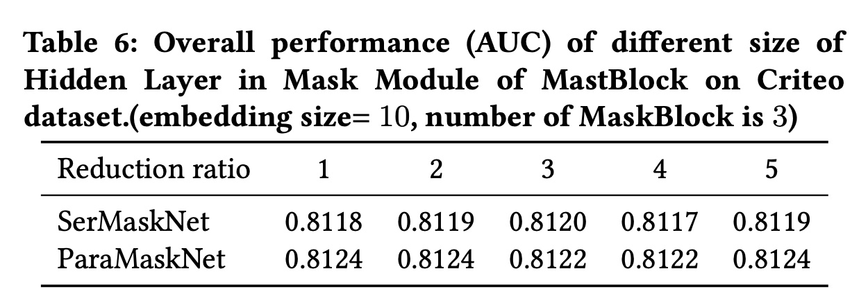 prediction layer 放置在这组 feed-forward networks 的最后一层上。在本文的后续部分,我们将这种版本的 MaskNet 称为“ParaMaskNet”。