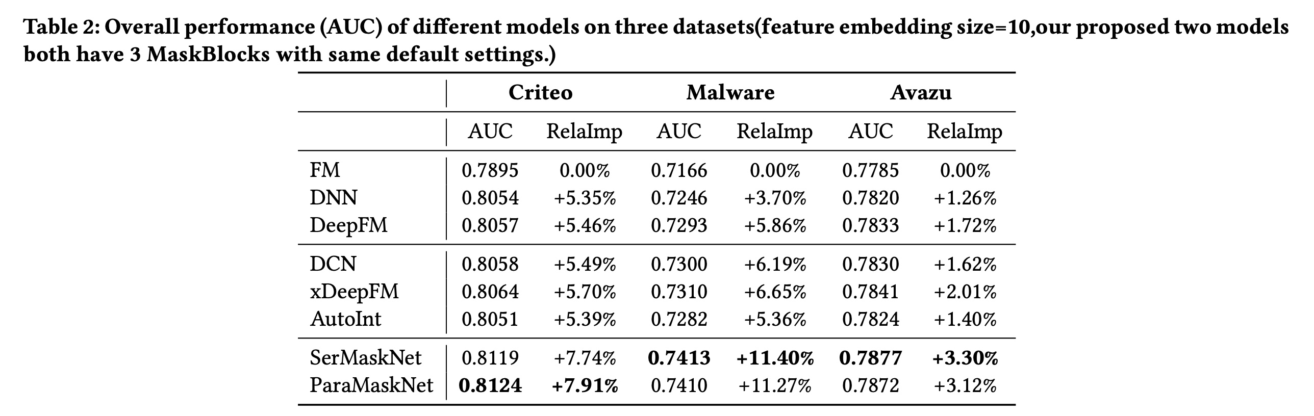 (4):在三个真实数据集上进行了广泛的实验。实验结果表明,我们提出的两种 MaskNet 模型显著优于 SOTA 模型。结果表明,MaskBlock 通过 instance-guided mask 向 DNN 模型引入 multiplicative operation ,确实增强了 DNN 模型捕获复杂特征交互的能力。
