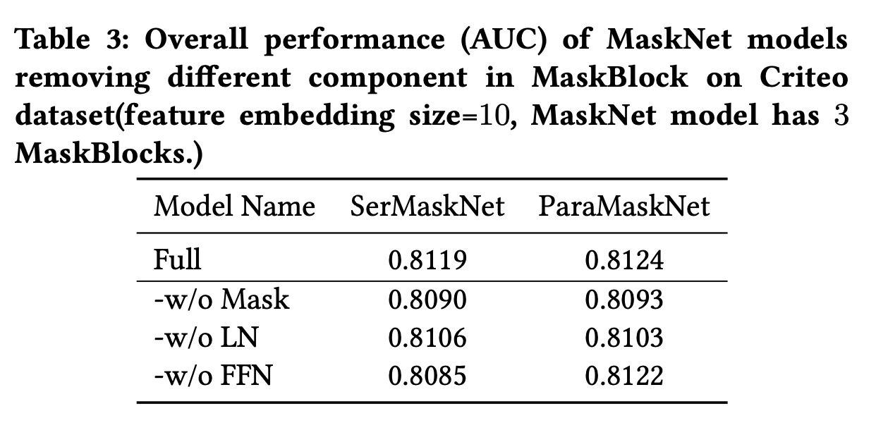 我们认为这表明:MaskBlock 中的 feed-forward layer 对于 instance-guided mask 之后聚合 feature interaction information 很重要。对于并行模型,并行 MaskBlock 上方的 multiple feed-forward layers 具有与 MaskBlock 中 feed-forward layer 类似的功能,这可能导致在移除 feed-forward layer 组件时两种模型的性能差异。