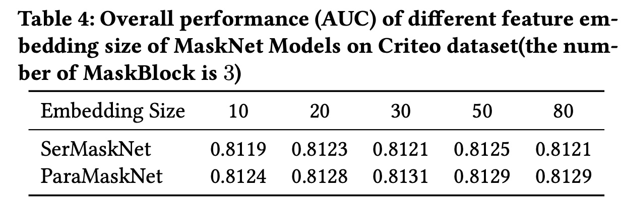 但当在 embedding size 设置为大于 50(SerMaskNet 模型)和 30(ParaMaskNet 模型)时,模型性能下降。
