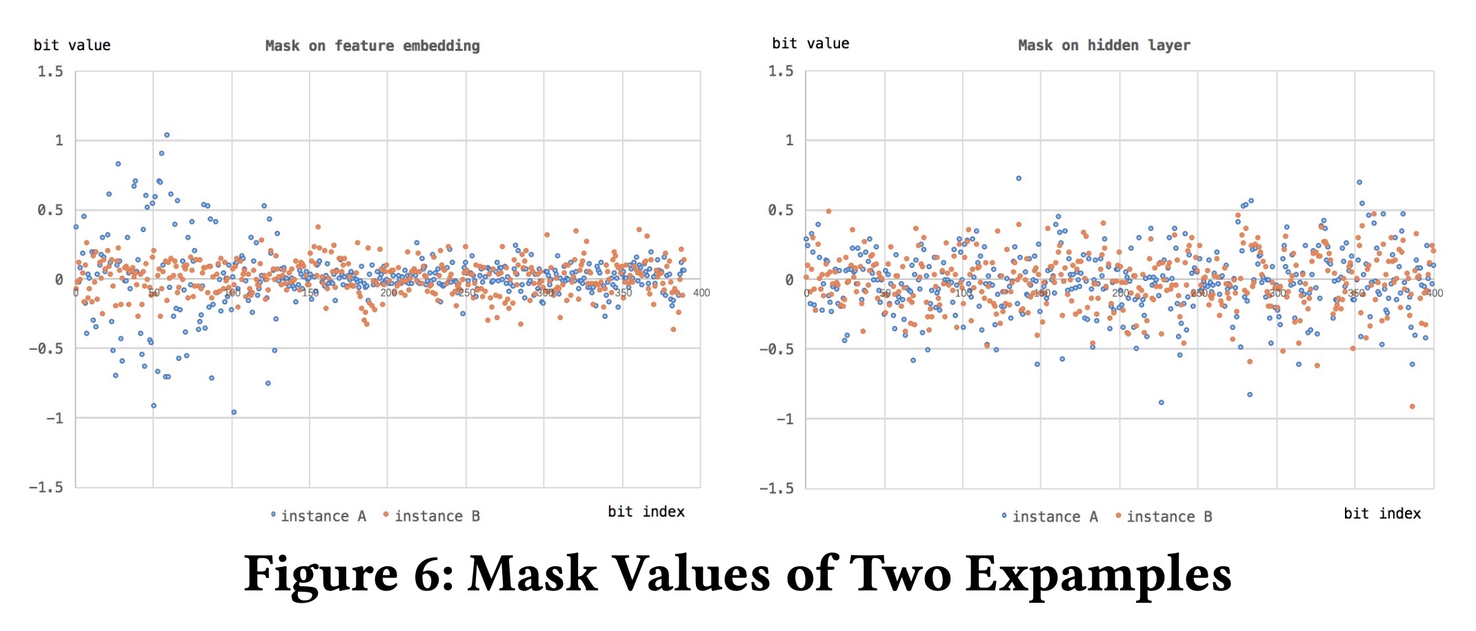 对于 feature embedding layer 的 mask values,不同的 input instances 导致 mask 关注不同的区域:instance A 的 mask outputs 更多地关注前几个特征,而 instance B 的 mask values 则关注其他特征的某些 bits 。