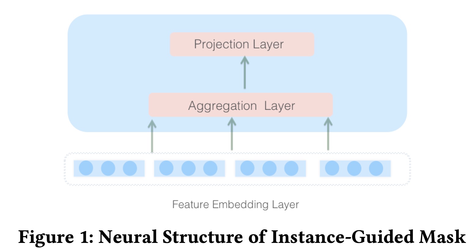 第一个 FC layer 称为 "aggregation layer"。与第二个 FC layer 相比,它是一个相对更宽的层,以便更好地收集 input instance 中的全局上下文信息。aggregation layer 具有参数 mask。对于 feature embedding layer 和不同的 MLP layers ,我们采用不同的 instance-guided mask ;每个 mask 拥有自己的参数,以从 input instance 中学习捕获各层的不同信息。