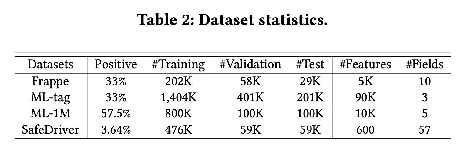 数据集:Frappe、ML-tag、SafeDriver和 ML-1M 。四个数据集的统计数据如 Table 2 所示。