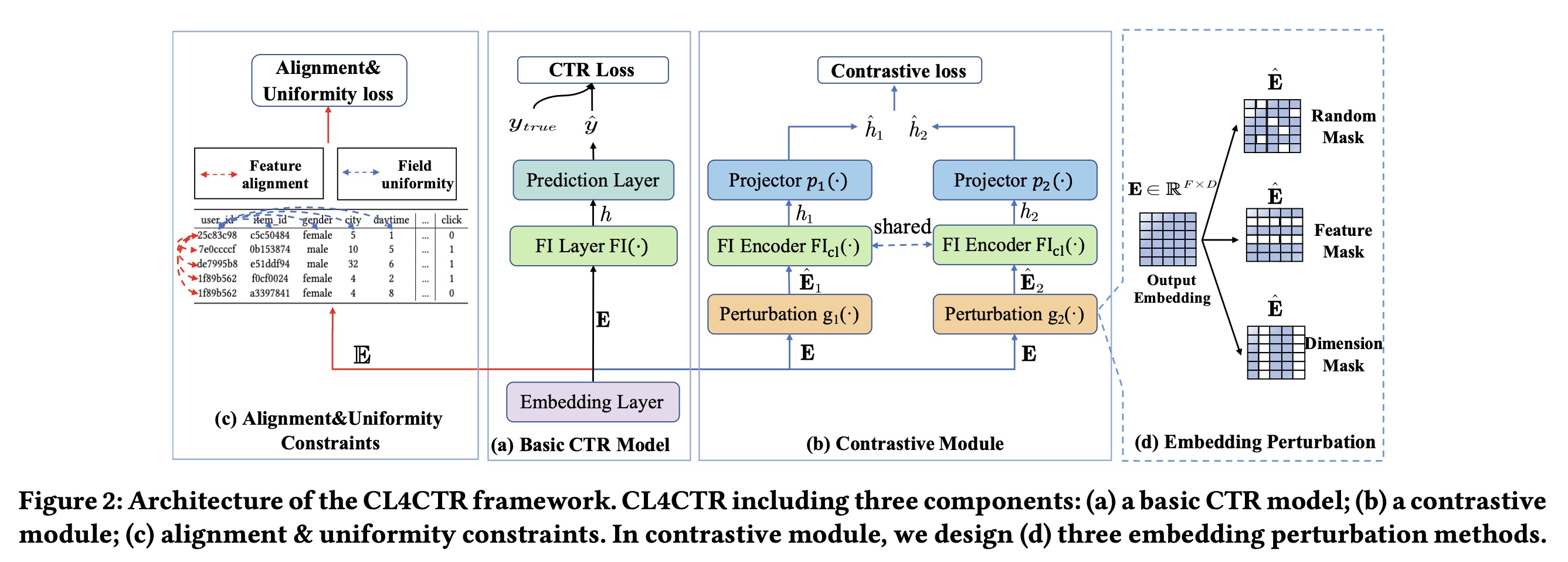 我们提出了一个与模型无关的对比学习框架 CL4CTR ,它可以以端到端的方式直接提高 feature representations 的质量。