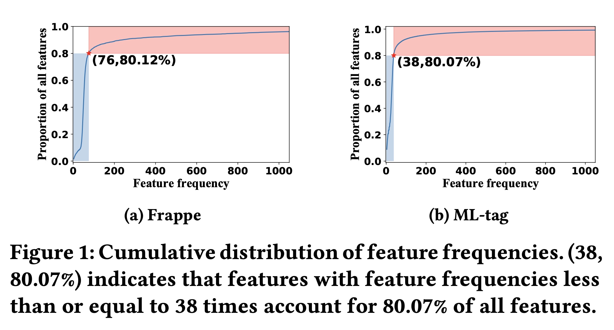 尽管在性能上取得了成功,但许多现有的CTR prediction 方法都存在一个固有问题:高频特征比低频特征有更高的机会被训练,导致低频特征的 representations 不是最优的。在 Figure 1 中,我们展示了 Frappe 数据集和ML-tag 数据集的特征累积分布(feature cumulative distributions )。我们可以观察到特征频率的明显“长尾”分布,例如,在 ML-tag 数据集中尾部 80% 的特征仅出现 38 次或更少。由于大多数 CTR prediction 模型通过反向传播来学习 feature representations ,低频特征由于出现次数较少而无法得到充分训练,导致 feature representations 不是最优的,从而导致 CTR prediction 性能也不理想。