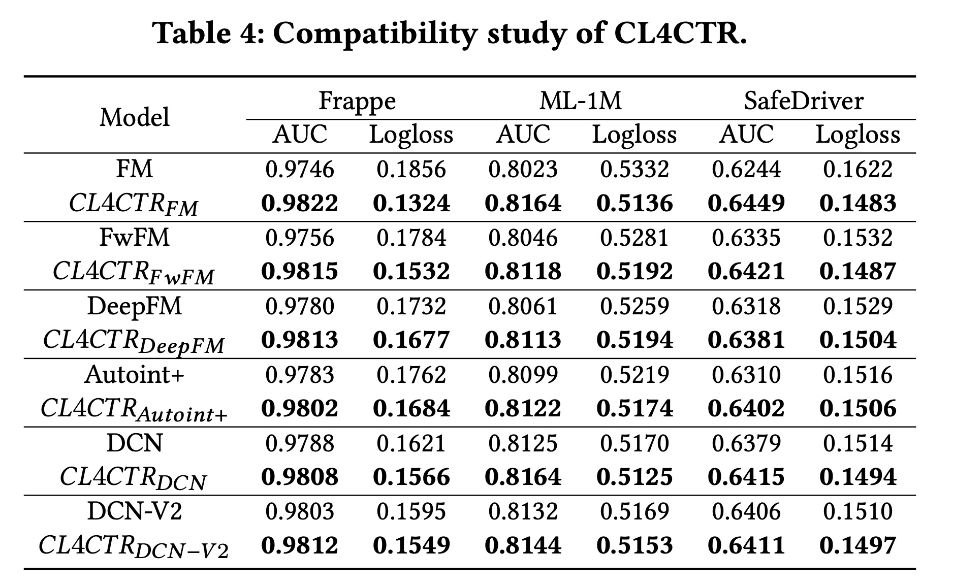 在四个数据集上进行的大量实验表明,只需将 CL4CTR 应用于FM 即可超越 SOTA 的方法。更重要的是,CL4CTR 与现有方法具有很高的兼容性,即它通常可以提高许多代表性的 baselines 的性能。