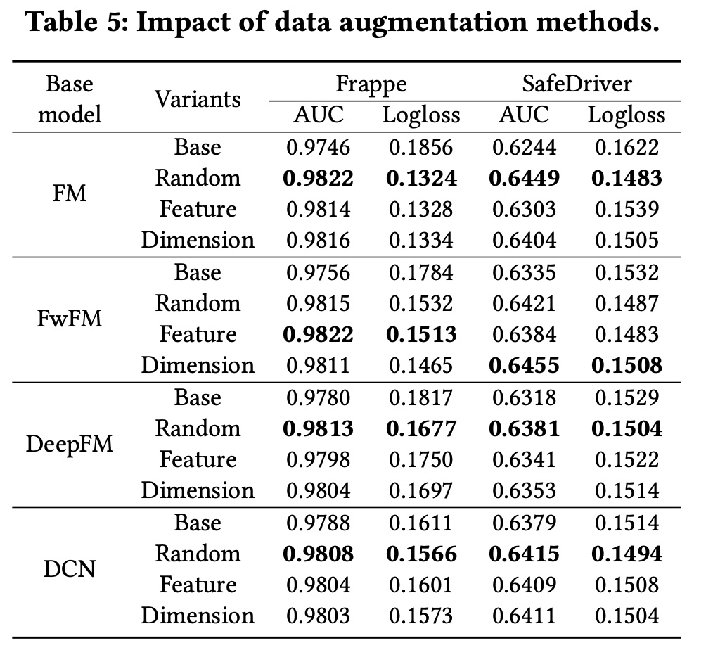 此外,在 Frappe 上,FwFM 模型使用 feature mask 方法取得了最佳性能;相反,在 SafeDriver 上FwFM 模型使用 dimension mask 方法取得了最佳性能,这表明我们提出的 augmentation 方法是有效的,并且可以用于不同的 baseline 模型和数据集。