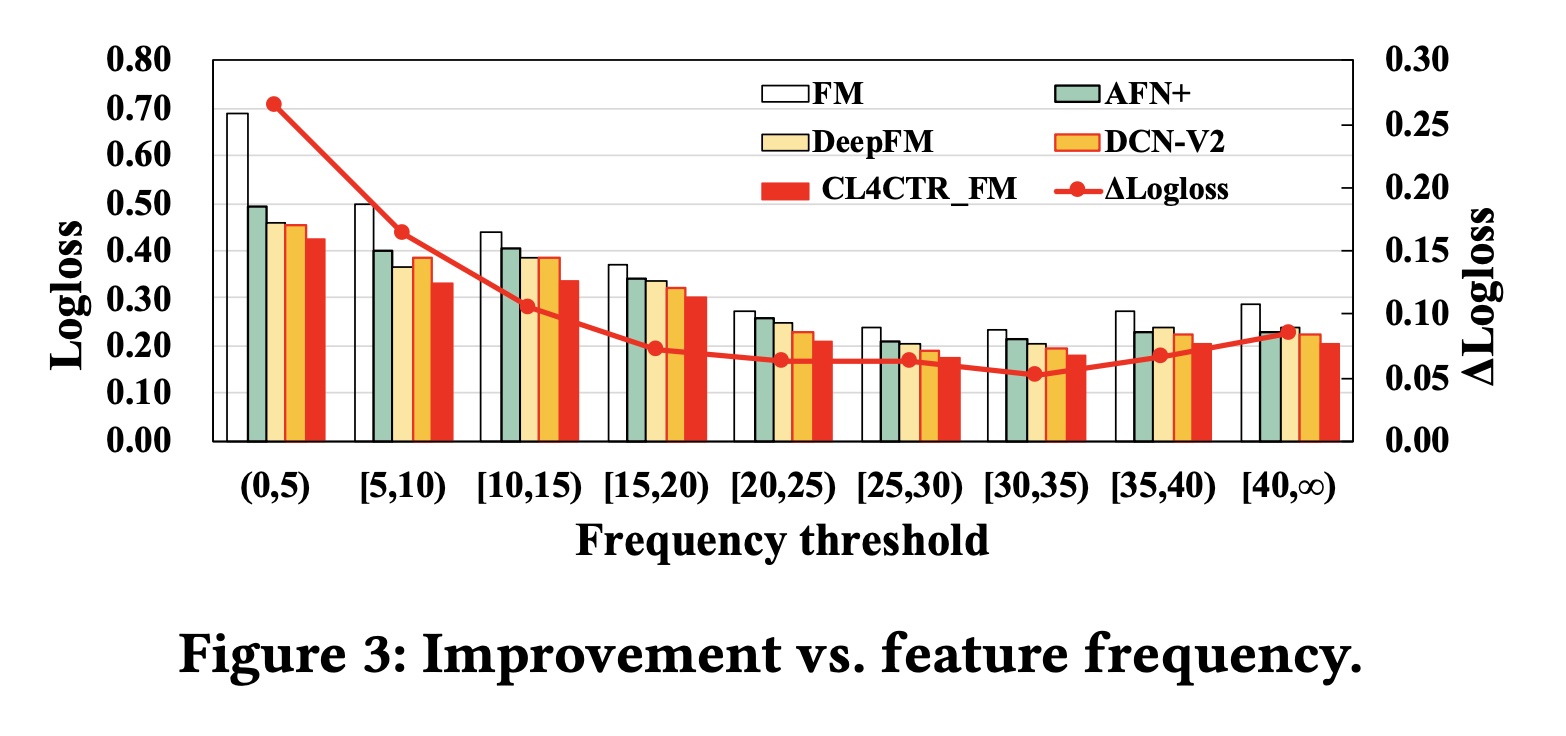 为了验证特征频率对不同模型的影响,我们将 ML-tag 测试集按照特征频率进行划分,并计算相应的Logloss ,其中 ΔLogloss 表示应用 CL4CTR 后相对于 base FM 模型的提升。Figure 3 展示了实验结果。