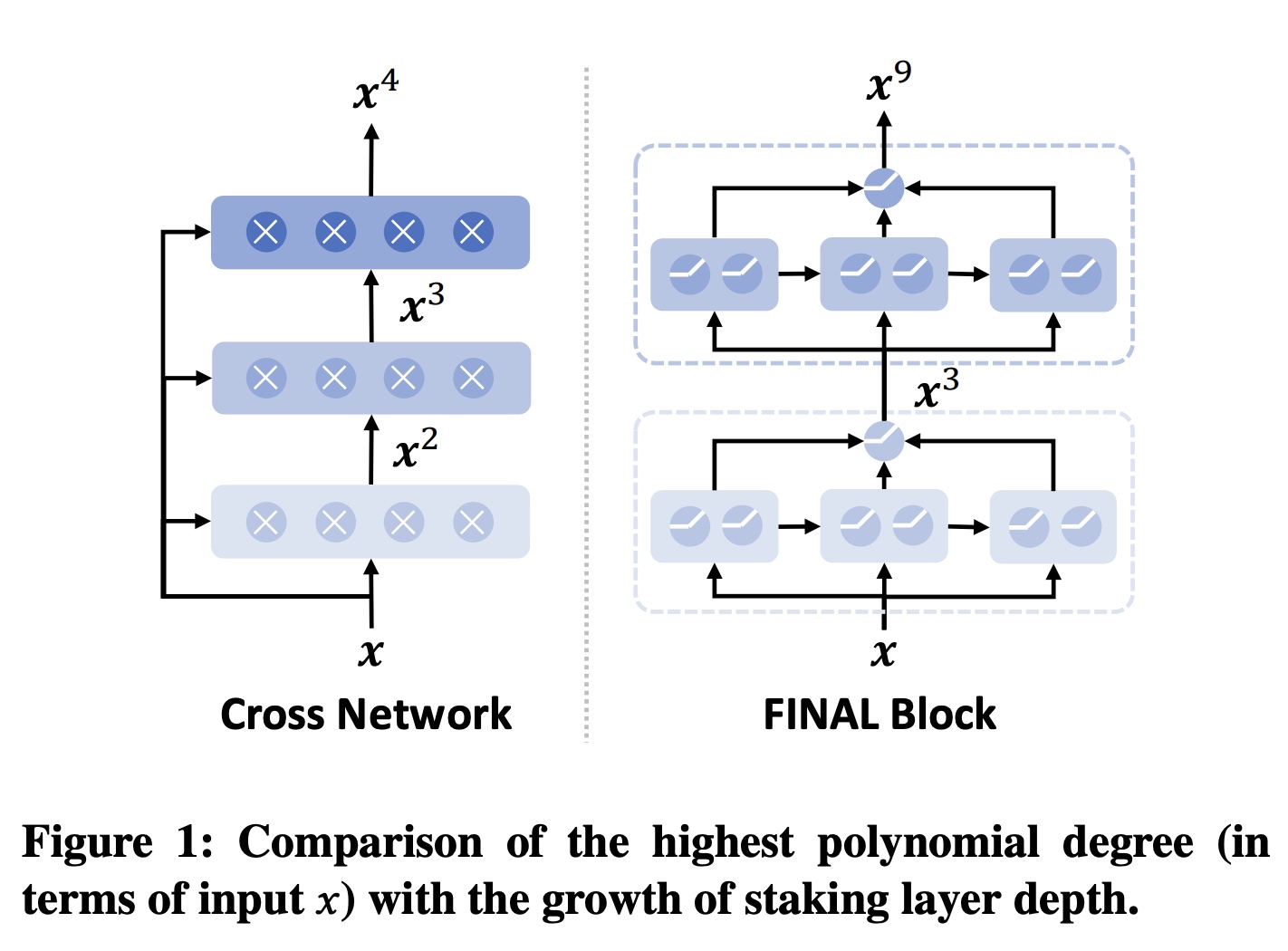 FINAL Block:我们方法的基本单元是FINAL block 。它接收一个flattened feature vector field ,例如one-hot features, embedded categorical features, and numerical features。由于工业场景中精心设计的特征的多样性、复杂性和异质性,特征之间的交互通常可能是很复杂的且隐式的。因此,建模高阶交互对于有效利用特征至关重要。在实践中,如何以最小的model depths 实现足够高的交互阶次,对性能和效率都很重要。