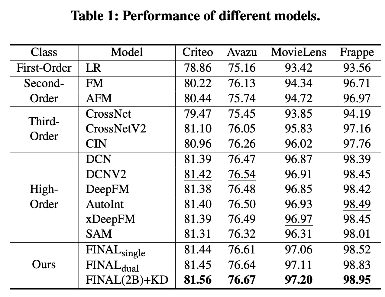 我们观察到FINAL block 一致地改进了流行的deep CTR 模型。这验证了FINAL 确实捕获了这些模型忽略的有用线索。由于FINAL 独立于backbone 架构,因此它是一个灵活的组件,可用于为实际系统中的各种CTR 预测模型提供支持。