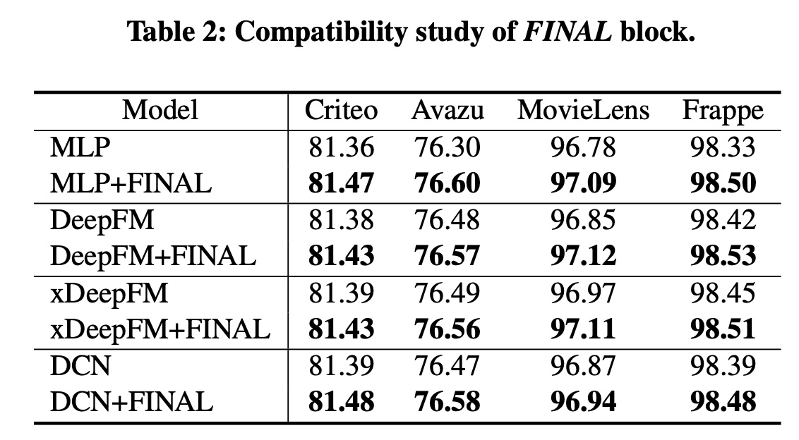 我们的FINAL block 是一个即插即用模块,可以提升各种deep CTR 模型的性能。为了证明FINAL block 的兼容性,我们将其作为MLP block 的替代品引入了四种流行的deep CTR 模型(即MLP, DeepFM, xDeepFM, and DCN ),结果如Table 2 所示。