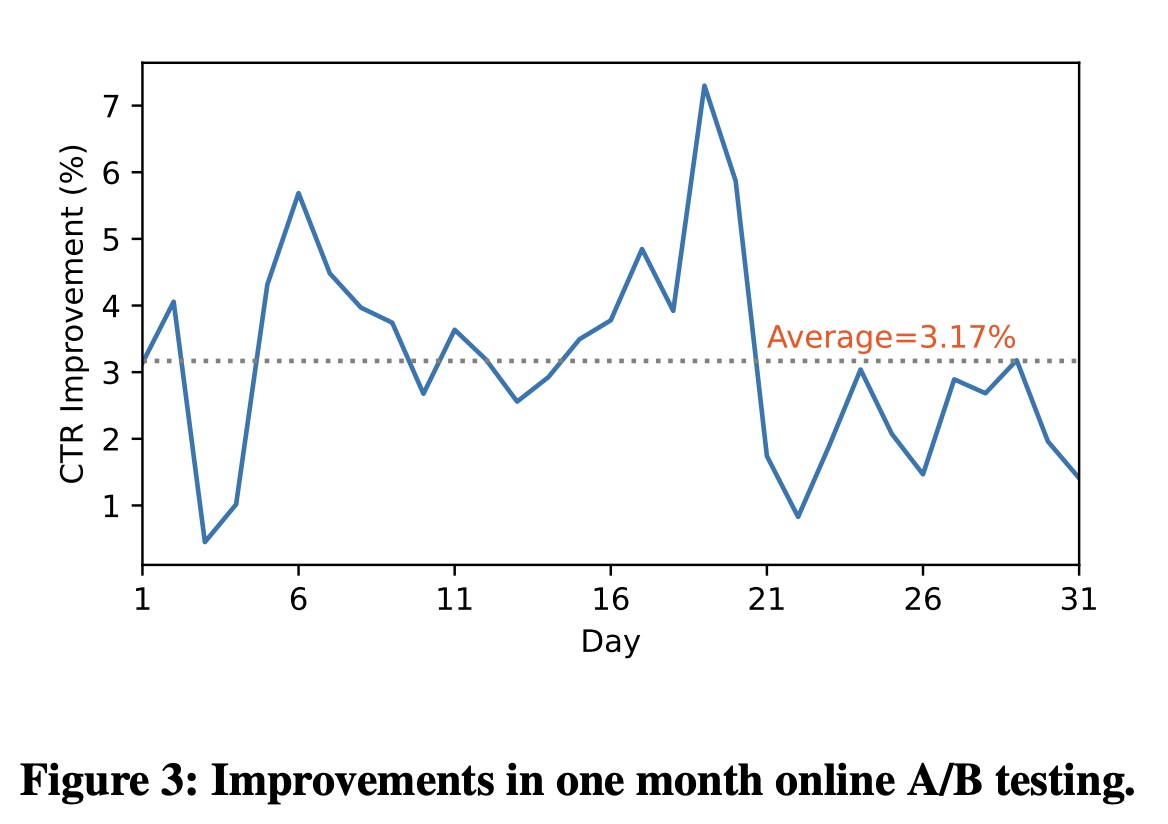 我们将我们的方法与精心设计的baseline 模型进行了比较。Figure 3 总结了连续30 天的在线结果。我们的模型在评估期间显示出一致性的在线点击率改进,平均点击率提高了3.17% 。additional online inference latency 增加了22.22% ,这在我们的系统中是可以接受的。实验结果证明了FINAL 在feed recommendation 中的有效性。