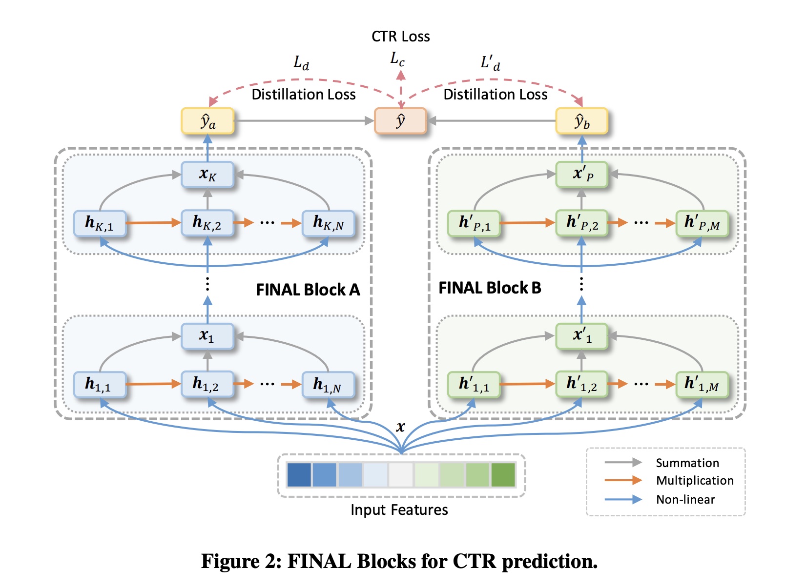在本文中,我们提出了一个Factorized Interaction Layer: FINAL 来显式地学习multiplicative feature interactions ,它可以实现非常高的combination orders 而无需繁琐的层堆叠(Figure 1 )。受fast exponentiation 算法的启发,FINAL 采用hierarchical 的方式以指数级速度提高feature interaction 阶次。在每个hierarchy 中,input representations 与一系列连续的non-linear layers 的representations output 相乘,从而逐步增加feature interaction 阶次。通过用多个hierarchies 处理feature representations ,feature interactions 的阶次进一步呈指数级增加。基于提出的FINAL 模块,我们设计了一个统一的框架,该框架结合了多个FINAL blocks 从而在不同视图中学习feature interactions ,并且我们通过使用它们的预测作为common teachers 来交换它们所编码的互补知识来进行自蒸馏(self-distillation )。我们在四个公共数据集上进行了广泛的实验,结果验证了FINAL 的优越性。它还在我们企业举办的多个商业场景的在线实验中取得了显著的成功。FINAL 为编写CTR 预测模型提供了一种全新而简单的选项,有望为各种推荐场景提供支持。