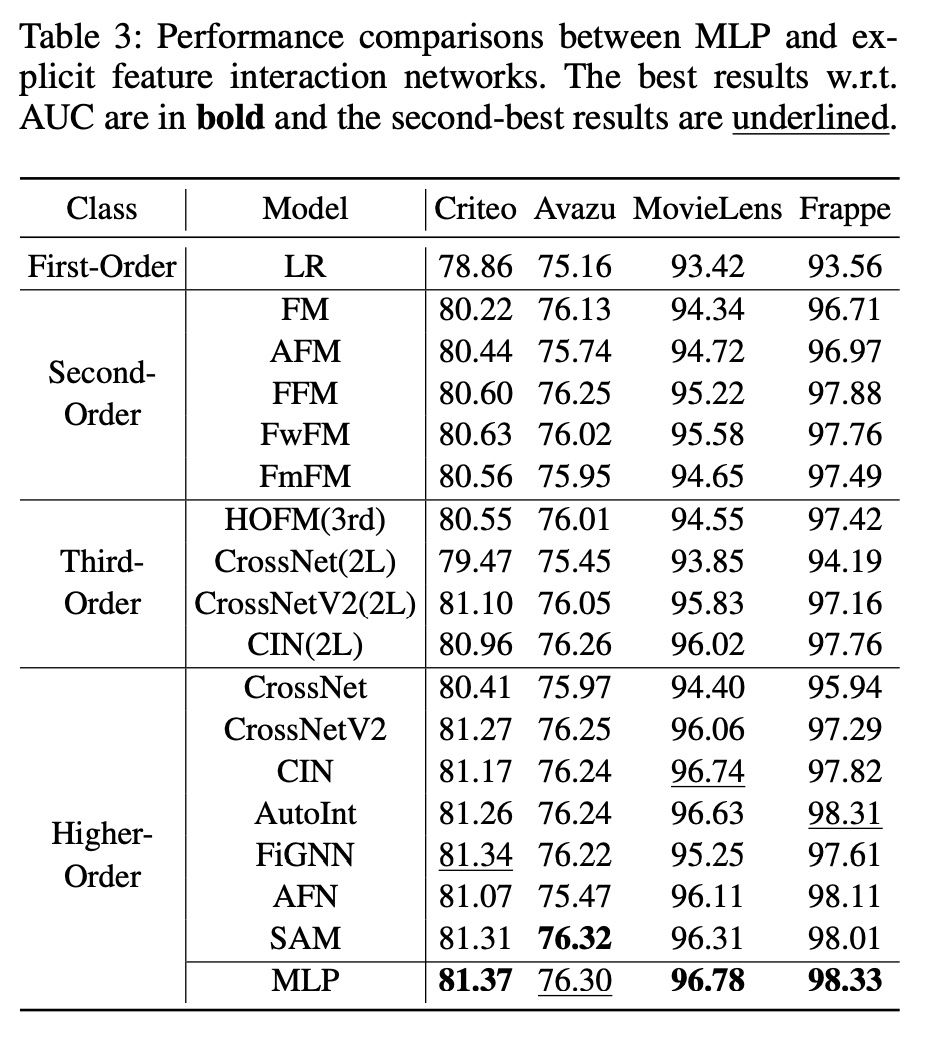 这里我们将MLP 与精心设计的feature interaction 网络进行比较,如下表所示。令人惊讶的是,我们观察到MLP 的表现可以与精心设计的显式feature interaction 网络不相上下,甚至超越它们。这一观察结果也与DCN-V2 论文中报告的结果一致,其中表明经过良好调优的MLP模型(即DNN )可获得与许多现有模型相当的性能。
