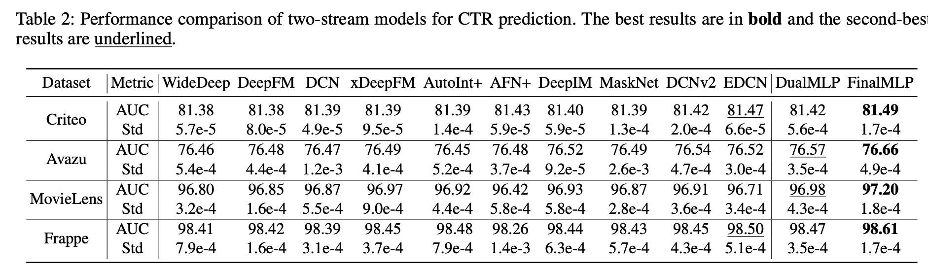 首先,我们可以看到双流模型通常优于Table 3 中报告的单流模型,尤其是单个MLP 模型。这符合现有工作,表明双流模型可以学习互补的特征,从而能够更好地建模CTR prediction。
