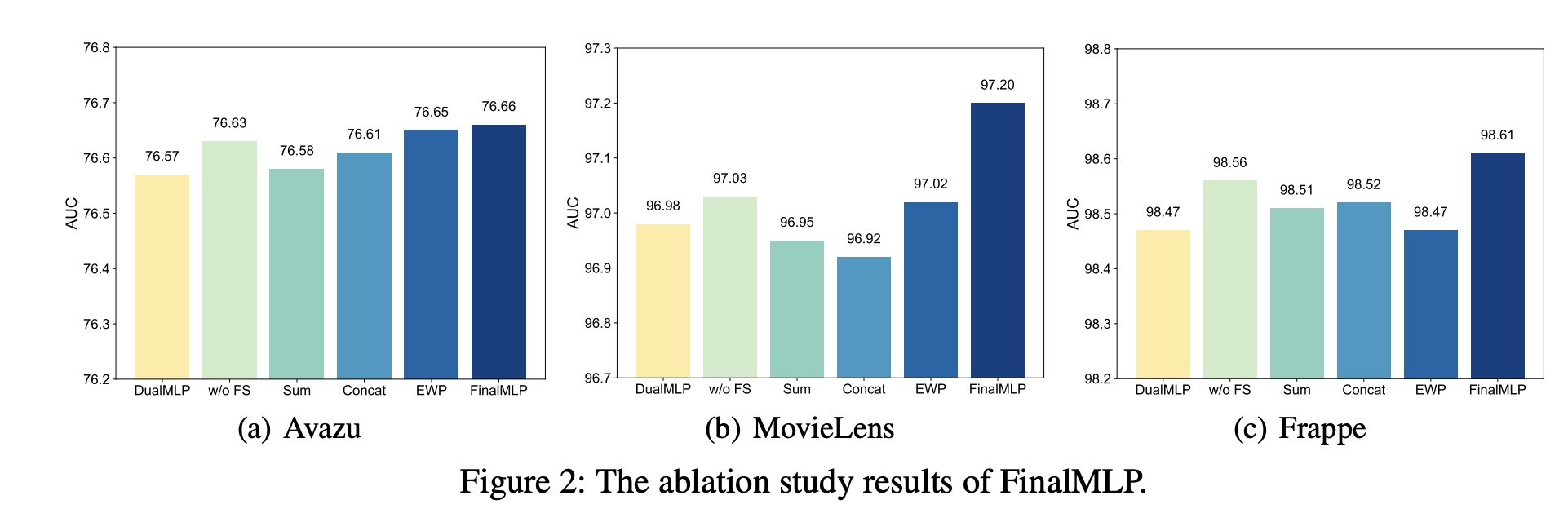 Feature Selection and Bilinear Fusion 的效果:具体来说,我们将FinalMLP 与以下变体进行比较: