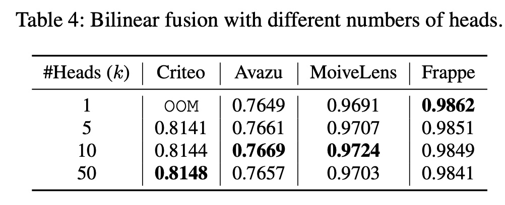 Multi-Head Bilinear Fusion 的效果:我们研究了subspace grouping 技术对bilinear fusion 的影响。下表显示了通过改变子空间数量(即heads 数量 bilinear fusion 时FinalMLP 的性能。OOM 表示在设置中发生Out-Of-Memory 错误。