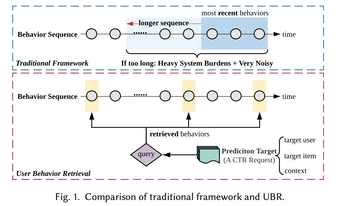 随着在线个性化平台十多年的发展,平台上记录的user behavior数量迅速增长。在淘宝上,仅在六个月内,就有 23% 的用户积累了超过 1,000 次behavior(《Lifelong sequential modeling with personalized memorization for user response prediction》)。尽管上述基于user behavior的 CTR 模型取得了巨大成功,但它们无法处理非常长的用户序列。如 Figure 1 上半部分所示,仅使用最近的行为进行 CTR estimation (通常为 50 或 100)。但是,如果仅使用最近的行为,序列中可能不包含长期依赖性或周期性等序列模式(sequential patterns )。一种直接的解决方案是将整个用户序列馈入到 CTR 模型中,但这不可行。它会给系统开销带来沉重的负担并牺牲推理效率。更糟糕的是,在非常长的行为序列中,这种做法会带来很多噪音。