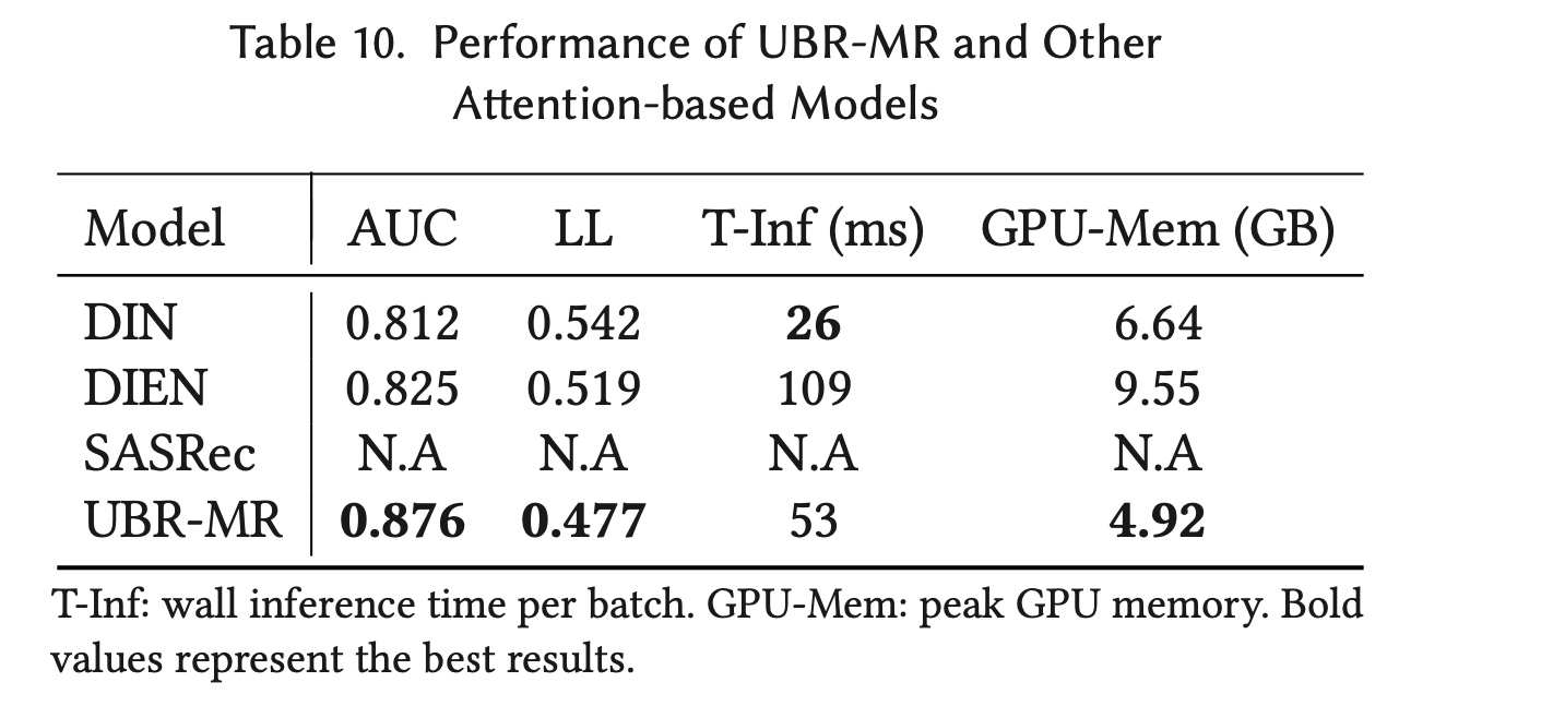 就开销而言,DIN 是最快的模型,但 UBR-MR 在速度上仍然优于 DIEN 。这种推理效率是可以接受的。