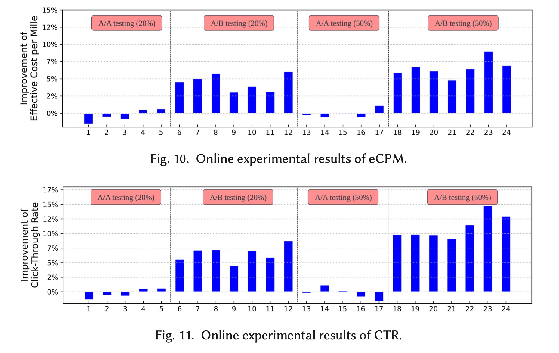 对于 50%流量的 A/B test ,eCPM 和 CTR 平均分别提高了 6.6% 和 11.1% 。