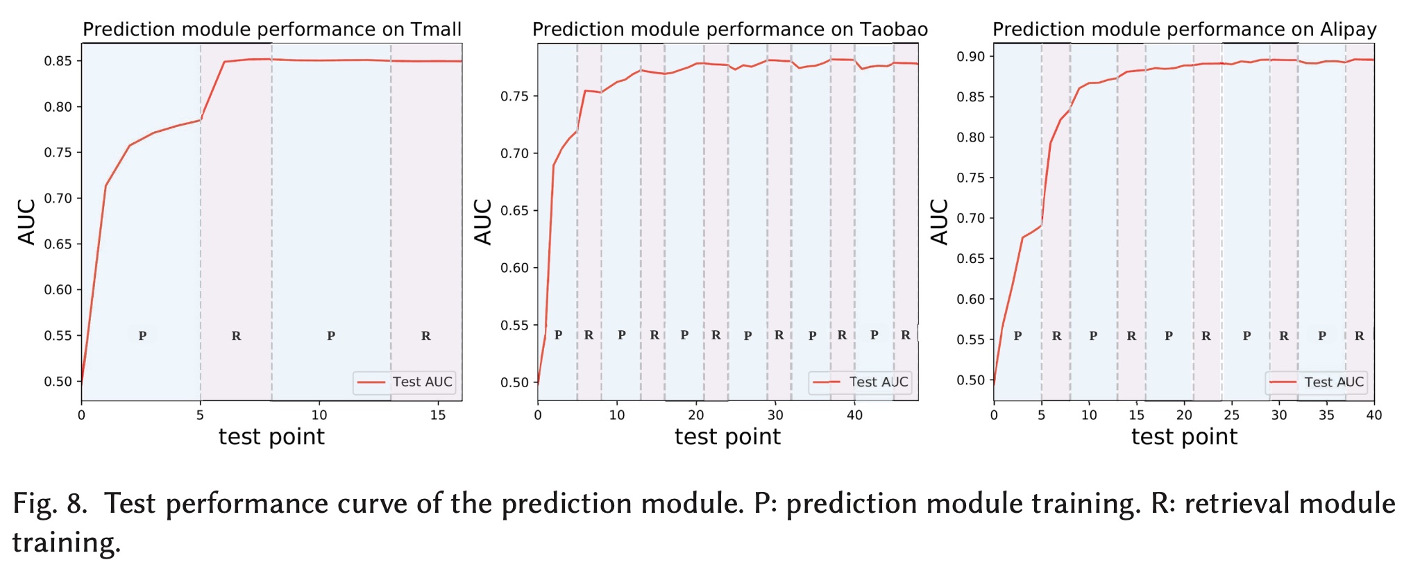 本节我们展示了 UBR 框架的训练过程。我们以 UBR-R 为例。prediction 模块的性能曲线如 Figure 8 所示。在曲线中,我们绘制了不同 test points 的 test AUC 值。图中,“P” 对应于 prediction 模块的训练过程(蓝色阴影区域),而 “R” 代表 retrieval 模块的训练(粉色阴影区域)。